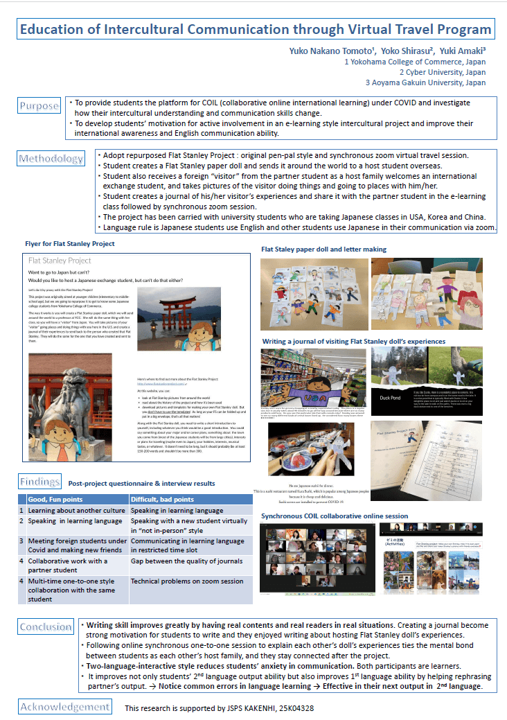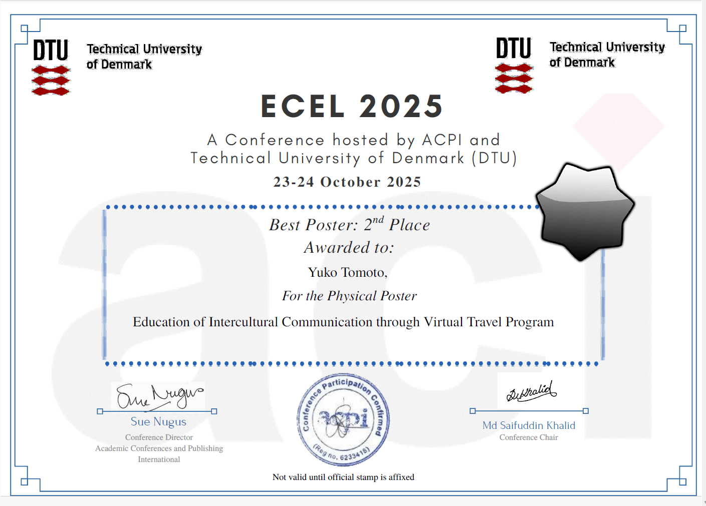 国際学会は、2025年10月23日、24日にデンマークのTechnical University of Denmarkで開催された「European Conference on E-Learning(ヨーロッパ e-ラーニング学会)」で、 研究発表した「Education of Intercultural Communication through Virtual Travel Program」が「Best Poster 2nd Place」(最優秀賞に次ぐ優秀賞)を受賞しました。