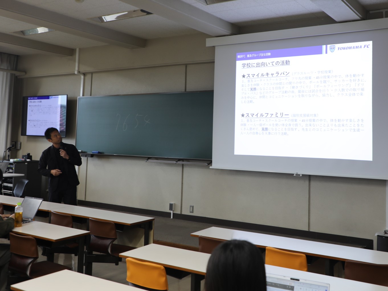 11月25日(火)2時限目に開講された授業「横浜のプロスポーツビジネス」(担当教員:小島敏明教授 )に、外部講師として横浜フリエサッカークラブ 普及ダイレクターの鯨井健太氏が登壇しました 。