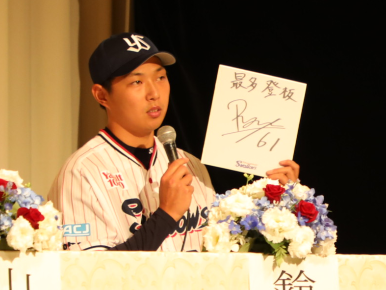 「自分は清水昇投手です。中継ぎとして投げ続け、シーズン最多ホールド記録はすごいなと思います。中継ぎとしての準備などを学ばせていただきたいと思っています。」