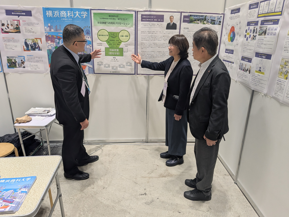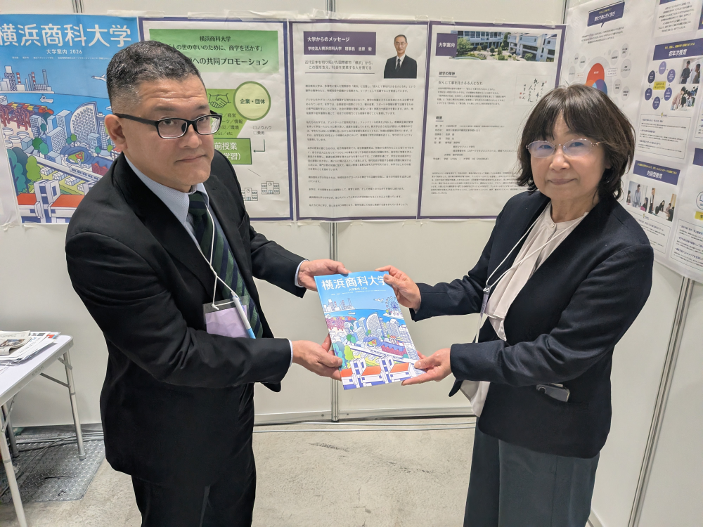 横浜商科大学のブースでは、横浜商科大学の学部・学科の紹介と、地域連携や産学連携の取り組みを紹介しました。 フェア期間中、企業・団体など約30社と名刺交換をさせていただくことができました。お話する中で、商品開発、プロモーション、イベントなど、大学との連携に対する関心度が高いことが確認されました。 また、はじめてフェアを視察した学生からは、想像以上の規模と情報量に圧倒された、時間をかけてじくり見て回りたい、ツアーのように説明を聞きながら回りたい、出展者から直接お話を聞ける機会は有意義だったなどの意見を聞き取る機会となり、次回につながる貴重なフィードバックを得ることができました。