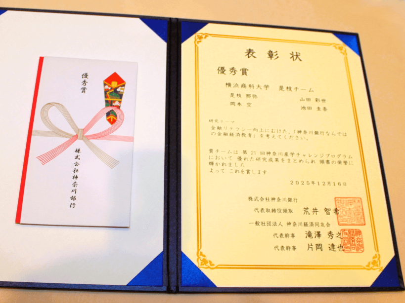 本プロジェクトを通じて、神奈川銀行様の課題解決に微力ではありますが、貢献することができましたことに、大変喜びを感じております。神奈川銀行の方々や本学関係者の皆様のご協力のもと、受賞することができた優秀賞は私自身の誇りとともにエネルギーとして、今後の人生に活かしてまいります。お忙しい中ご協力頂いた皆様、大変ありがとうございました。