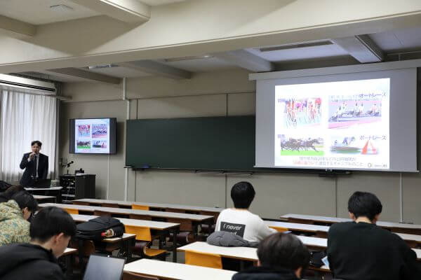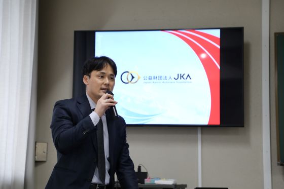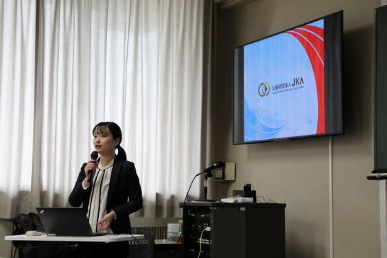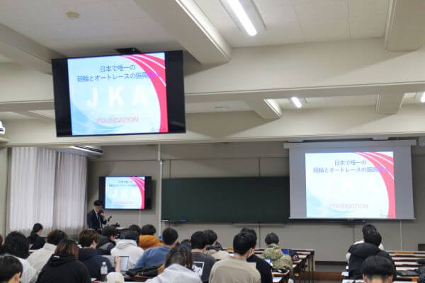 講義では、競輪・オートレースの成り立ちや、レースの公正かつ適切な運営を担うJKAが「レースの鼓動を、人と社会に響かせる。」をテーマに事業運営を行っている事が紹介されました。特に学生の関心を集めたのは、売上の一部が社会貢献に役立てられているという点です 。
