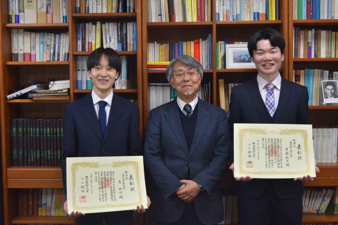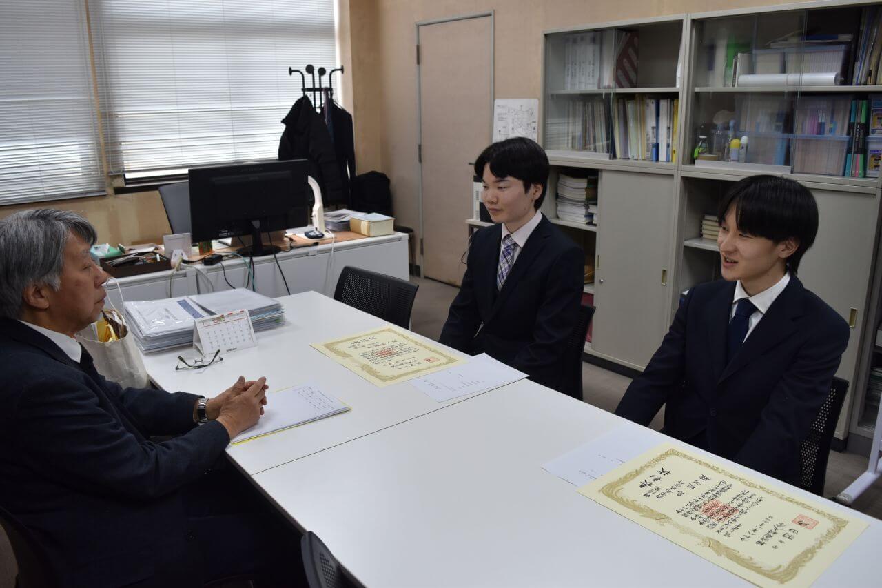 学長室にて執り行われた特待生認定式では、学長より表彰され、表彰後は羽田学長より激励の言葉を含め、歓談が行われました。