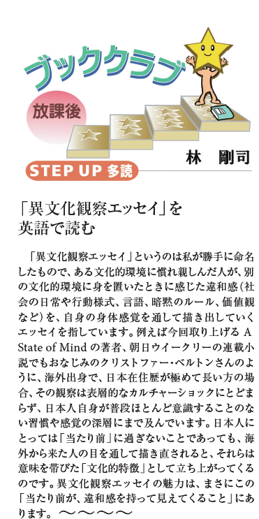 1月には、クリストファー・ベルトン著 A State of Mindについて「異文化観察エッセイ」と題して解説しました。記事では作者であるクリストファー・ベルトン氏が日本生活を通して日本への一目ぼれ体験をつづっています。本誌では、林准教授の解説により本の紹介にとどまらず、多読の狙いや効果、英語学習のヒント、英語圏の文化や風習などを学ぶことができます。