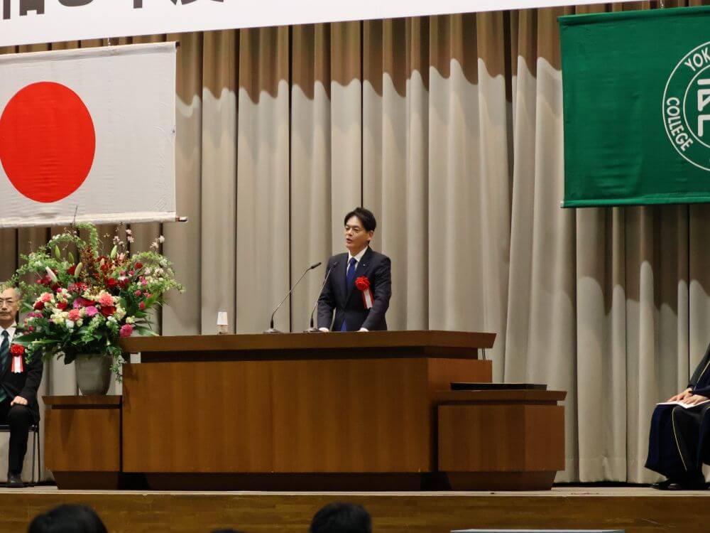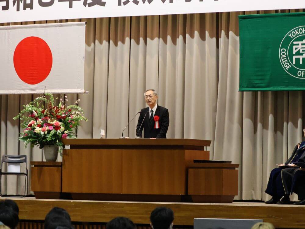 佐々徹副学長による学事報告の後、原科幸彦学長からの式辞、吉原毅理事長からの祝辞が述べられました。また、来賓として山中竹春横浜市長よりご祝辞を賜り、続いて育友会の岸野令会長より、温かいお祝いの言葉とともに育友会と同窓会からの記念品が贈呈されました。
