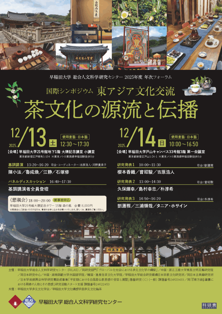 本学の久保輝幸教授が、早稲田大学 総合人文科学研究センター 年次フォーラムとして開催される国際シンポジウム「東アジア文化交流-茶文化の源流と伝播」にご登壇されます。