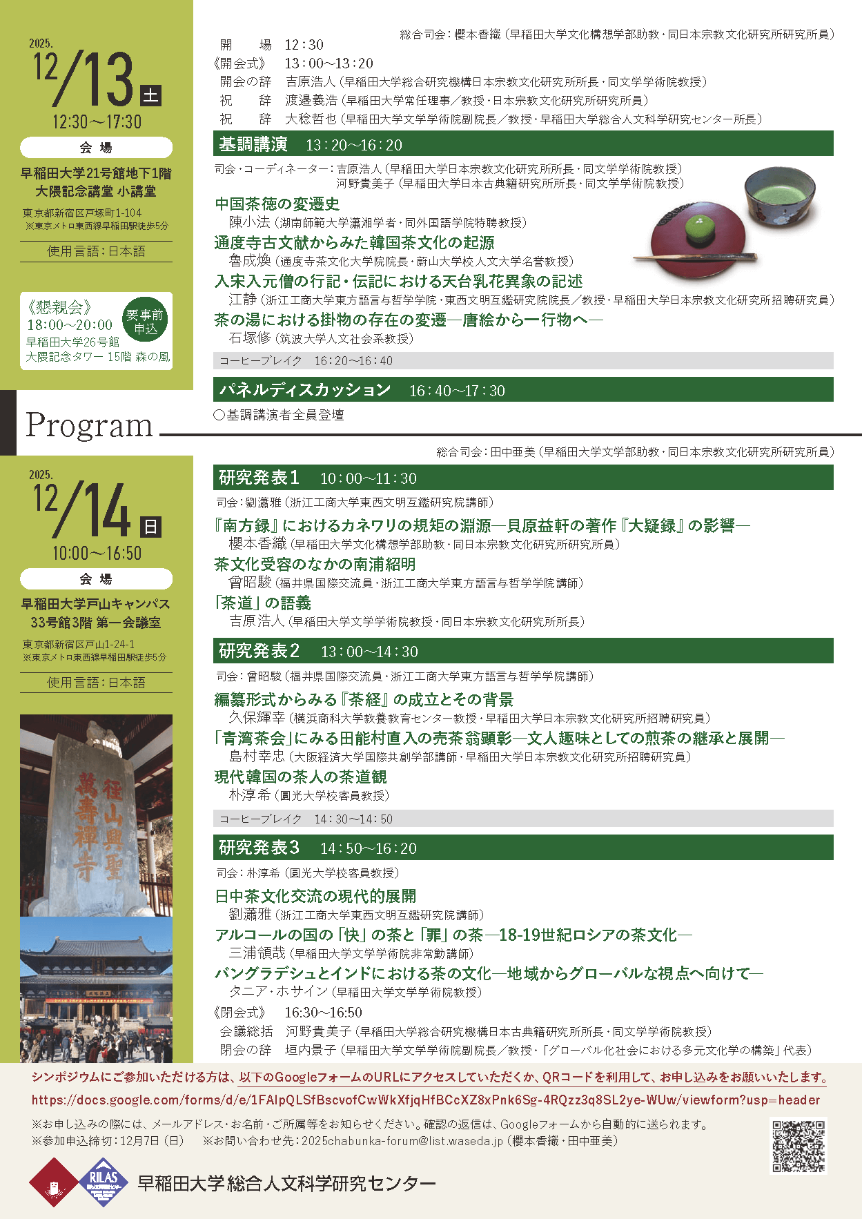 | 日程 | 日程:2025年12月13日(土)〜14日(日) 1日目:12月13日(土)12:30〜17:30(会場:大隈記念講堂 小講堂) 2日目:12月14日(日)10:00〜16:50(会場:戸山キャンパス33号館 第一会議室) | 参加方法 | シンポジウムへのご参加は事前申込制です。 ・申込締切:12月7日(日) ・申込方法:以下のGoogleフォームURLよりお申し込みください。 ・URL: https://docs.google.com/forms/d/e/1FAIpQLSfBscvofCwWkXfjqHfBCcXZ8xPnk6Sg-4RQzz3q8SL2ye-WUw/viewform?usp=header ・※お申し込みの際には、メールアドレス・お名前・ご所属等をお知らせください。 |