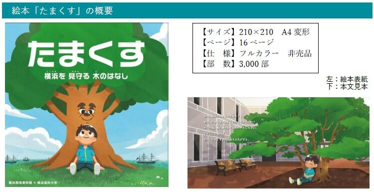 横浜商科大学は、令和7年6月2日に横浜開港資料館(管理運営:公益財団法人横浜市ふるさと歴史財団)と「学生による文化観光の情報発信に関するプロジェクト」を実施するため覚書を締結しました。 このたびプロジェクトの成果として、横浜開港のシンボルツリー「たまくすの木」を紹介する絵本が完成しましたのでお知らせいたします。